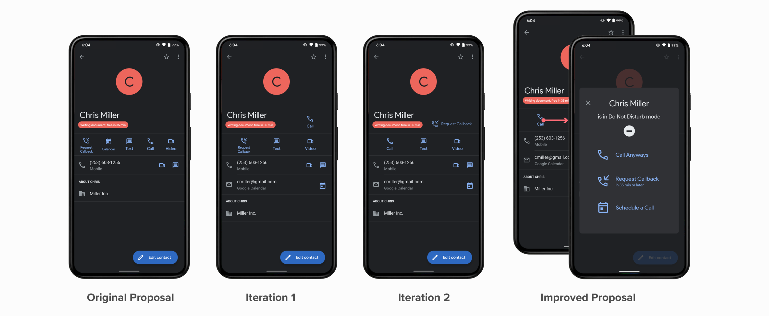 Then I iterated it to focus on the preferred option among the two and made the area clean. However, the participants were still not happy about their call button getting relocated. The Iteration 2 proposal tried to address the familiarity issue but had less success in preventing the user from hitting the “Call” button before reading the red status.