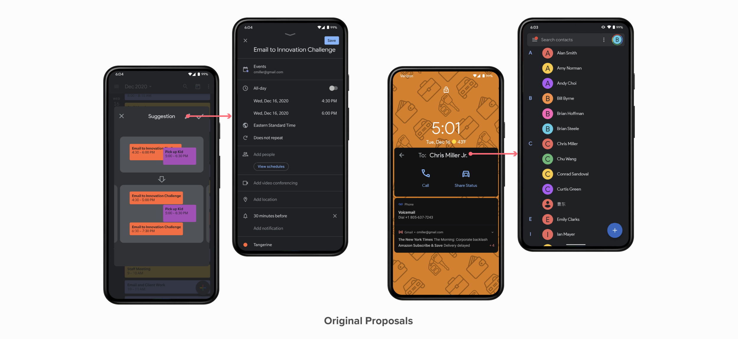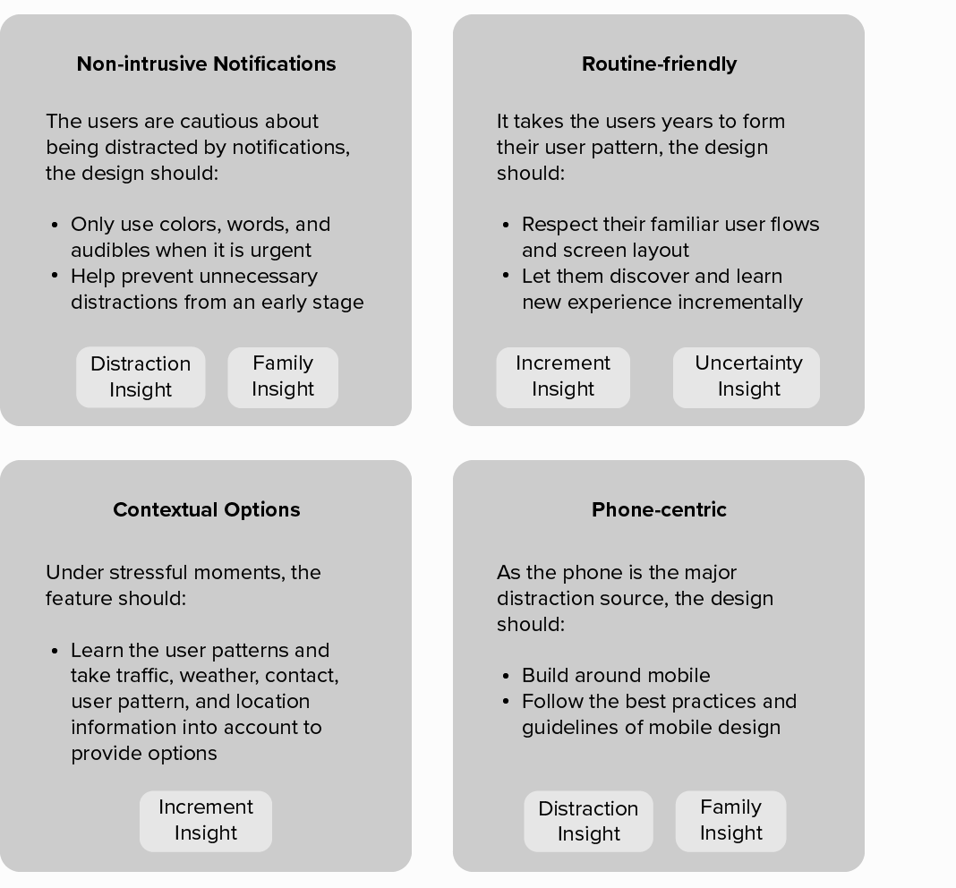 Numerous ideas are generated under the guiding principles. I selected the Schedule Assistant, Call Assistant, and Contextual Lock Screen to develop a systematic solution.